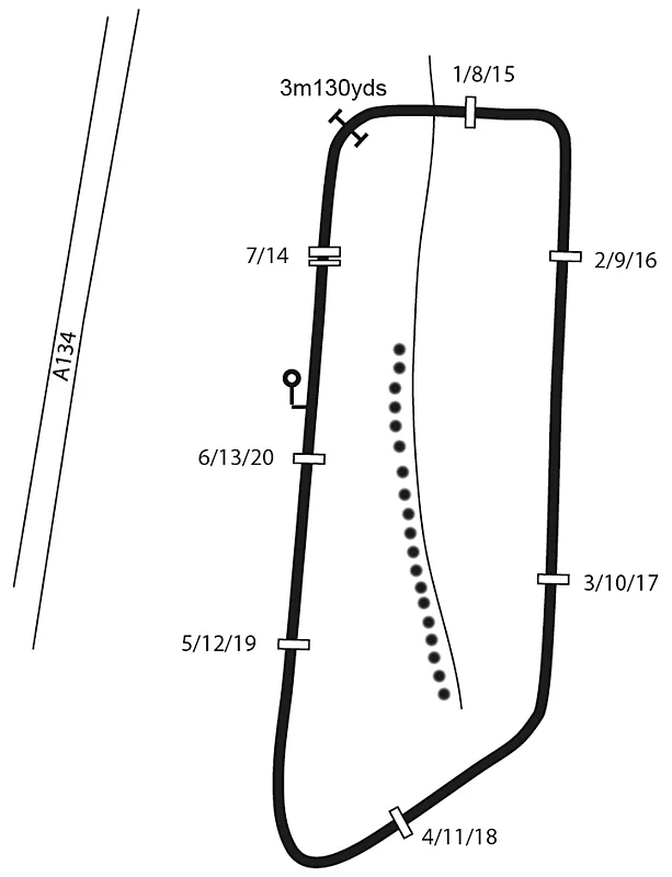 4 miles north of Bury St Edmunds just off the A134. Right-handed course laid out on the side of a hill, the back straight is sharply downhill with a tricky fence at the bottom, while the home straight and final two fences are on a stiff climb. Easy access and good viewing.