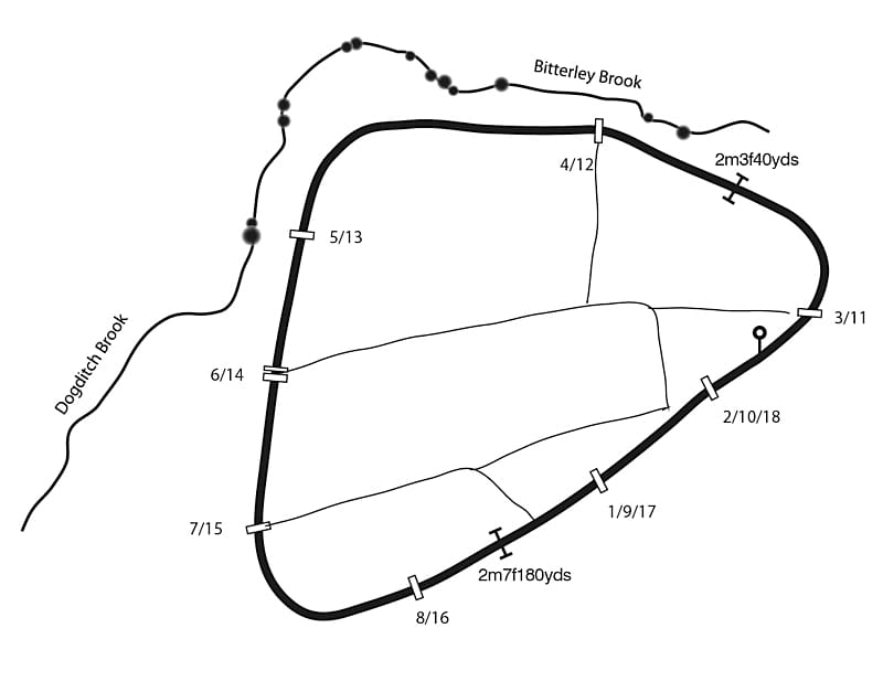 Short but galloping, basically flat course with gradual uphill finish from 3 out; fences (all bar three are metal framed) very small and stiff, and not to be hurdled; last fence narrow.
