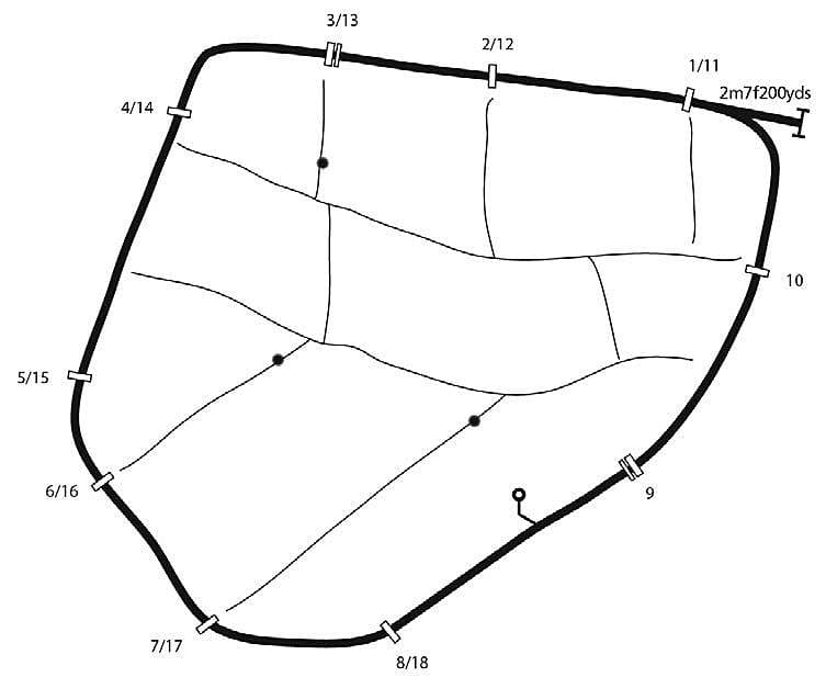 Undulating course on hillside; downhill from 3rd (13th), uphill from 9th; sweeping bends; permanent fences are well made; well drained.