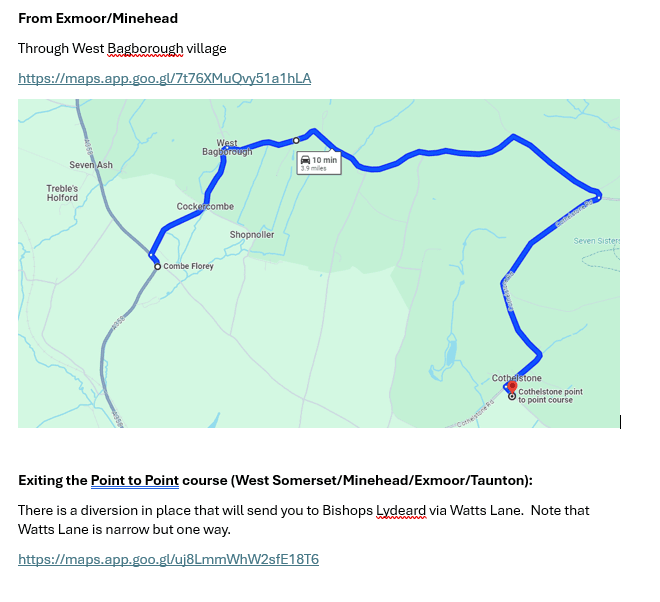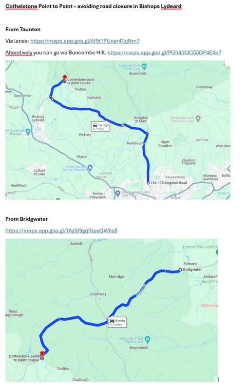 Quantock point to point at Cothelstone goes ahead as planned. However, normal route through Bishops Lydeard is blocked. If coming through Taunton go to Kingston St Mary and follow the signs from there (will turn left just before the village)