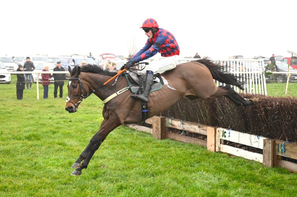 James followed up in the Exeter Racecourse Intermediate qualifier race when partnering Coeur D’Alene to a straightforward winner over his principal rival Ultimate Survivor ridden by Darren Andrews. After drawing clear after jumping the third last he was soon in command and had eight lengths in hand at the line. Now the winner of three races this season Chris Barber his trainer explained that ‘ he is now much more streetwise and races enthusiastically’ .He may have an entry in the final of this race but his part owner Paul Thorman is undecided about regulation fences and commented that ‘ it is lovely to have so much fun with him pointing this season’