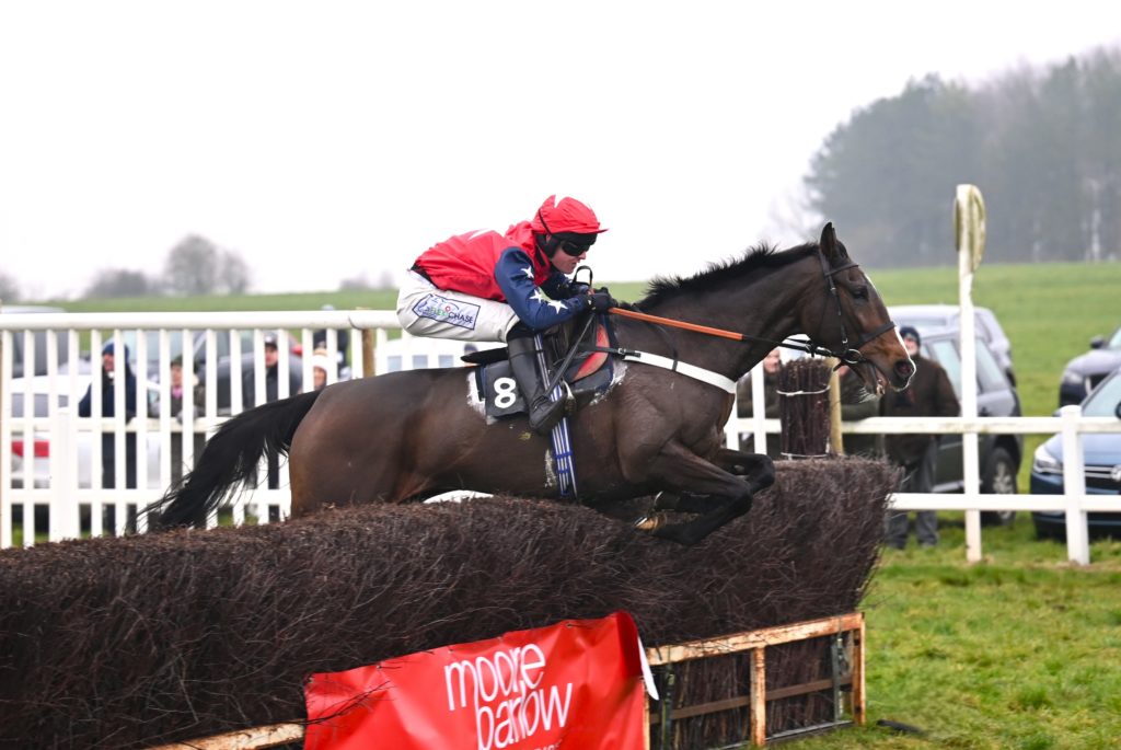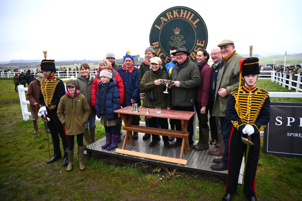 The loudest cheer of the day followed the success of Corporal JackJones in the Conditions race sponsored by the Gentlemen of the Royal Artillery Hunt. Trained as her only horse by Poppy Skipper for the Hive Partnership a group of local friends he continues on the upward curve following his win at Chaddesley Corbett over two a half miles. Taking it up at the second last Darren Andrews had to keep his willing mount up to his work to hold off the very late challenge of Farnoge ridden by Freddie Fletcher. Sporting a very fetching pair of blue cheekpieces the gelding did stay the full three miles which had been in question but Darren thought that ‘ this trip is more suitable for him’. Registering his fourth success of the season, Darren has already beaten his score from last term and added that ‘ I am enjoying my riding much more this season and hope to keep it going’ Poppy did indicate that she hopes to win the South Dorset Hunt race with him.